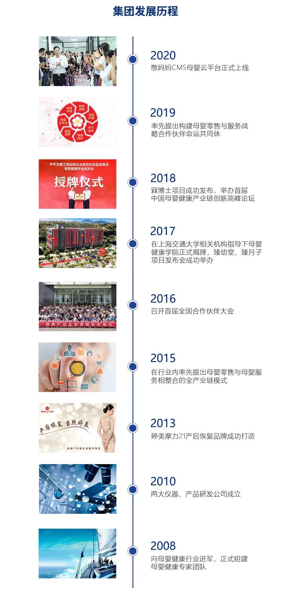 梅氏健康集團自(zì)2008年(nián)以來(lái),秉承“一心鑄就(jiù),百年(nián)健康”的企業願景,不斷開創。2013年(nián),婷美摩力21産後恢複品牌成功打造;2015年(nián),在行業内率先提出母嬰零售與母嬰服務相(xiàng)整合的全産業鏈模式;2017年(nián)在上海交通大(dà)學相(xiàng)關機(jī)構指導下母嬰健康學院正式揭牌;臻幼堂、臻月子項目發布會成功舉辦;2018年(nián)槑博士項目成功發布,并舉辦了首屆中國(guó)母嬰健康産業鏈創新高峰論壇。母嬰零售與服務産業鏈在這一年(nián)形成閉環;2019年(nián),梅氏健康集團繼續完善升級産業鏈闆塊,率先提出構建母嬰零售與服務戰略合作(zuò)夥伴命運共同體(tǐ);2020年(nián),憨媽媽CMS母嬰雲平台正式上線,梅氏健康集團發展到今天已成爲中國(guó)母嬰健康産業鏈創新發展領軍品牌。